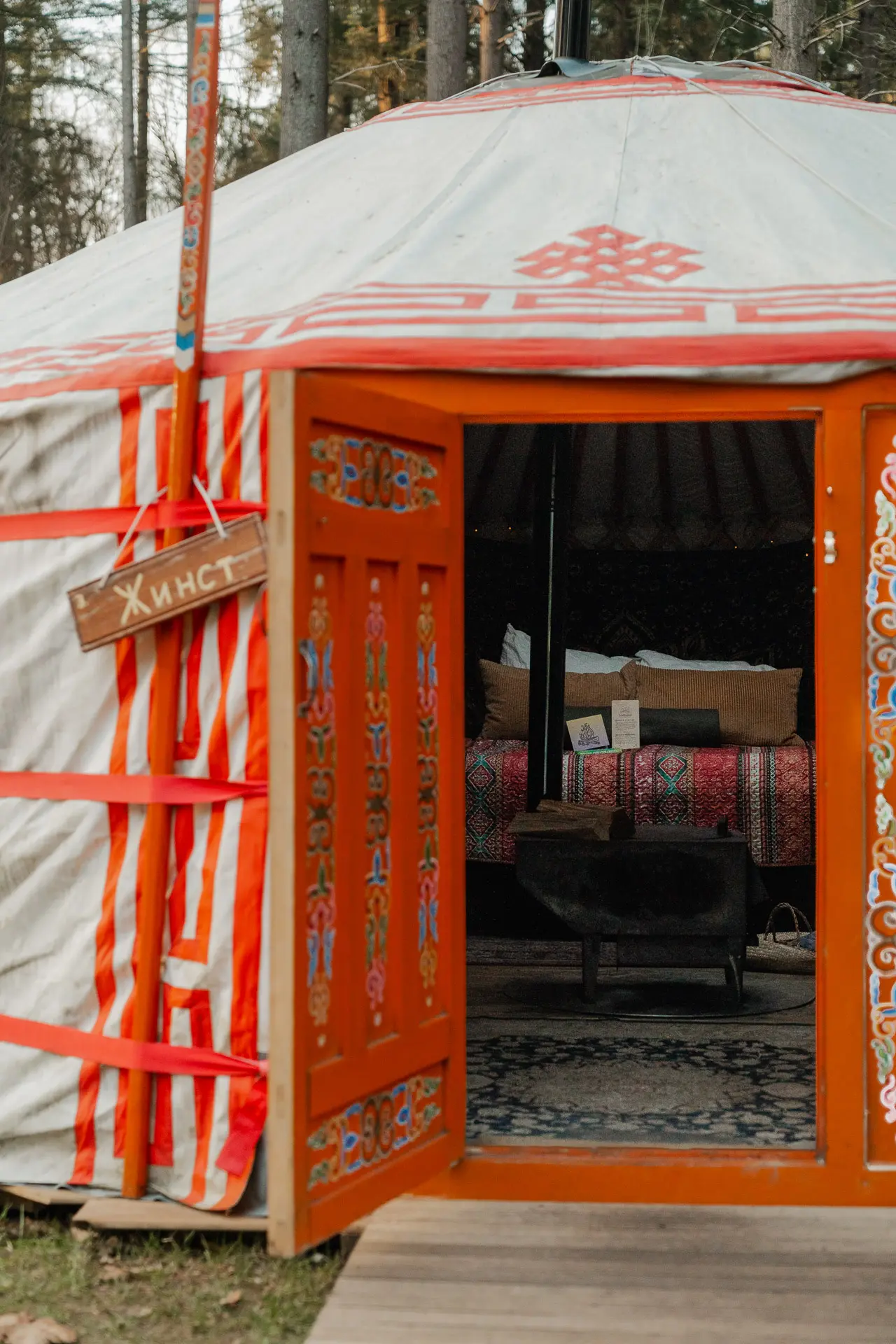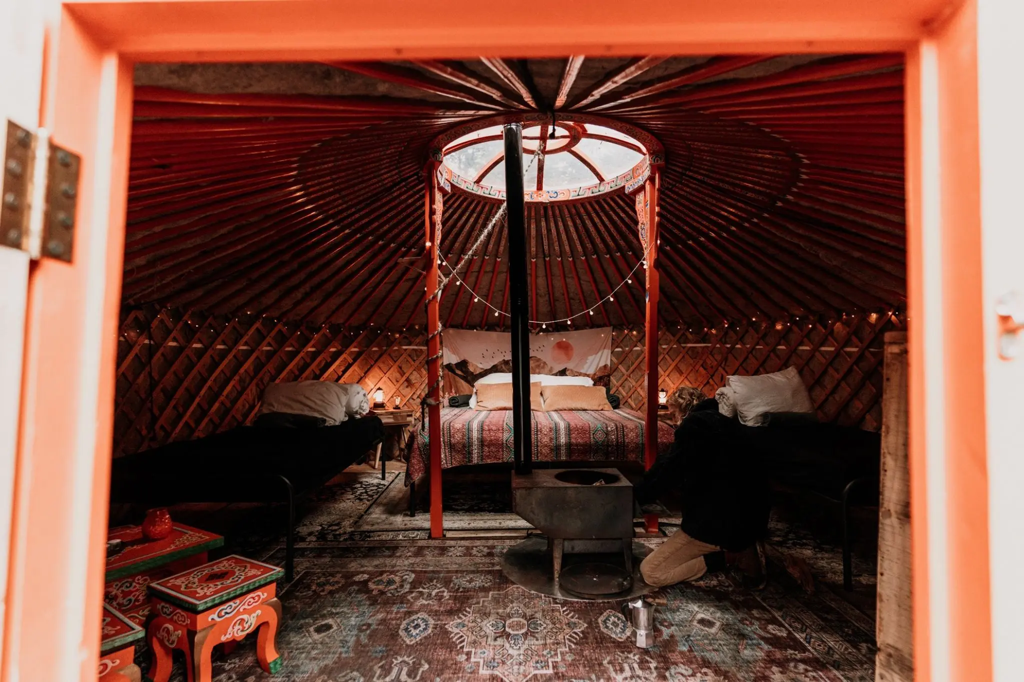 Binnen is een yurt simpel maar sfeervol ingericht: houten meubels, zachte kleden, kleurrijke schilderingen en natuurlijk de houtkachel die centraal staat. De kachel verwarmt de ruimte gelijkmatig en zorgt dat het binnen aangenaam warm blijft, zelfs op de koudste dagen.